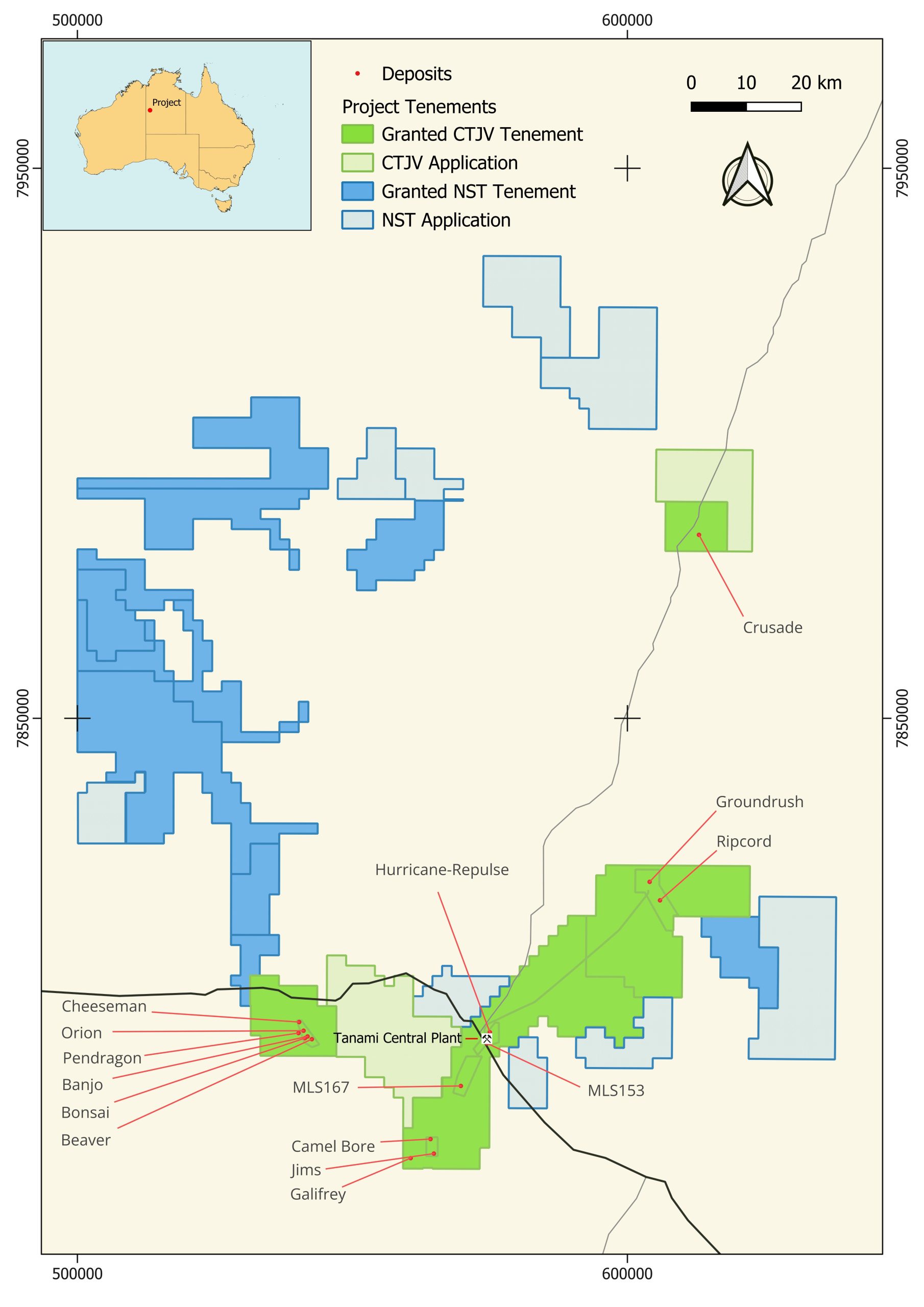 The objective of the CTPJV is to advance the Central Tanami Gold Project, a highly prospective and underexplored area that is known to be well-endowed with gold mineralisation. In excess of 2 million ounces (Moz) of gold have previously been extracted from the tenements, including approximately 1.3 Moz between 1995 and 2005. The CTPJV includes a non-operating 1.2 Mtpa carbon-in-leach (CIL) processing plant which has been idle since 2005, and the high-grade Groundrush gold deposit which yielded production of more than 600,000oz from a single open pit for Newmont Mining Ltd between 2001 and 2005. In addition, the CTPJV infrastructure assets include existing mine haul roads, an accommodation camp, a water bore field and a 1.4km gravel airstrip.